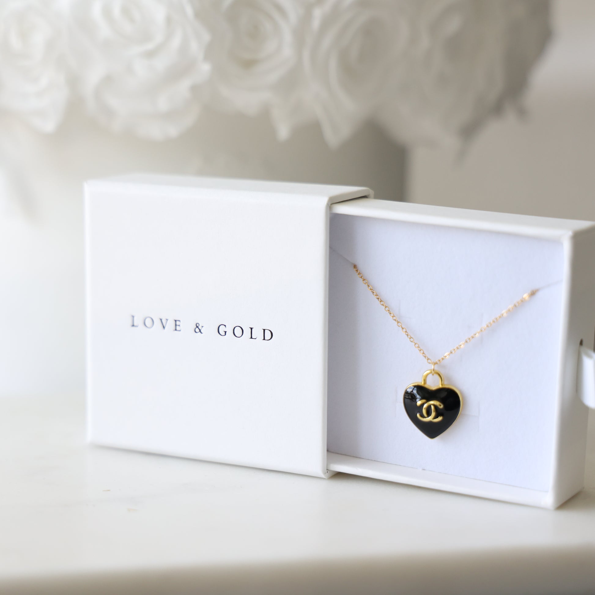 A glossy black heart pendant on a delicate gold chain. Effortless, chic, and endlessly wearable — a little touch of midnight magic.